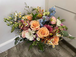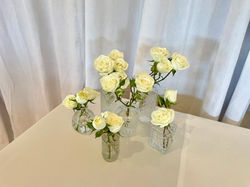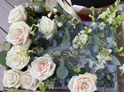 Soft, romantic white roses, stock, ranunculus, and lisianthus accented with pops of pale blush pink and lush greens for a timeless look.