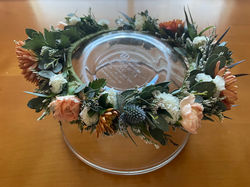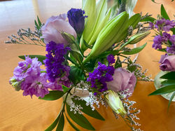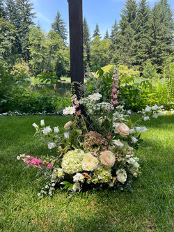 For their forest fairy theme, we used a variety of hydrangea, paired with white roses and wildflowers with mauve accents