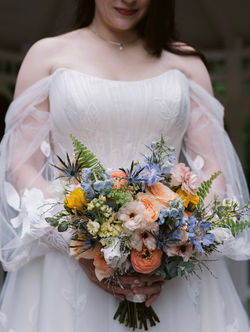 Bright citrus tones with pops of blue and lavender brought color and vibrancy to this couple's rainy brunch wedding
