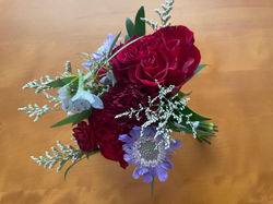Deep burgundy, red, and wine tones accented with wildflowery pops of blue and white for this rustic setting.