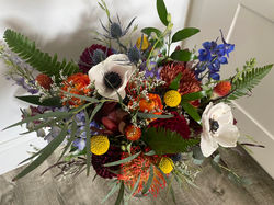 Rich jewel tones, classic fall flowers, wildflowery textures, and pops of the bride's favorite white anemone!