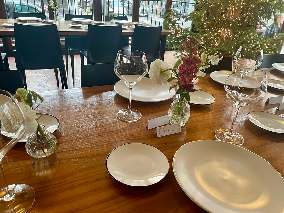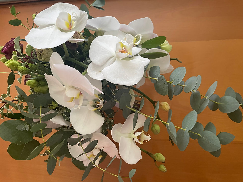 Soft white seasonal blooms with the bride's favorite orchids, mauve accents, and a touch of mistletoe overhead